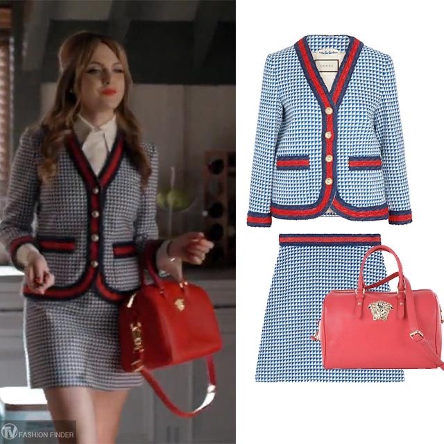 하늘색과 흰색이 섞여있는 하운드투스 패턴 자켓과 스커트를 투피스로 입고 라인의 색깔과 맞춰 레드컬러의