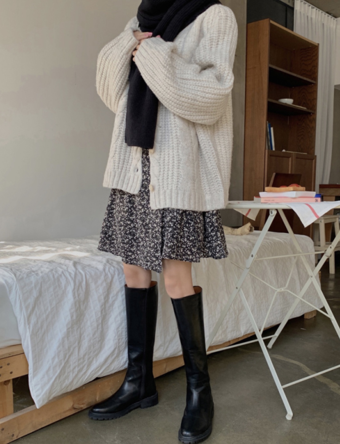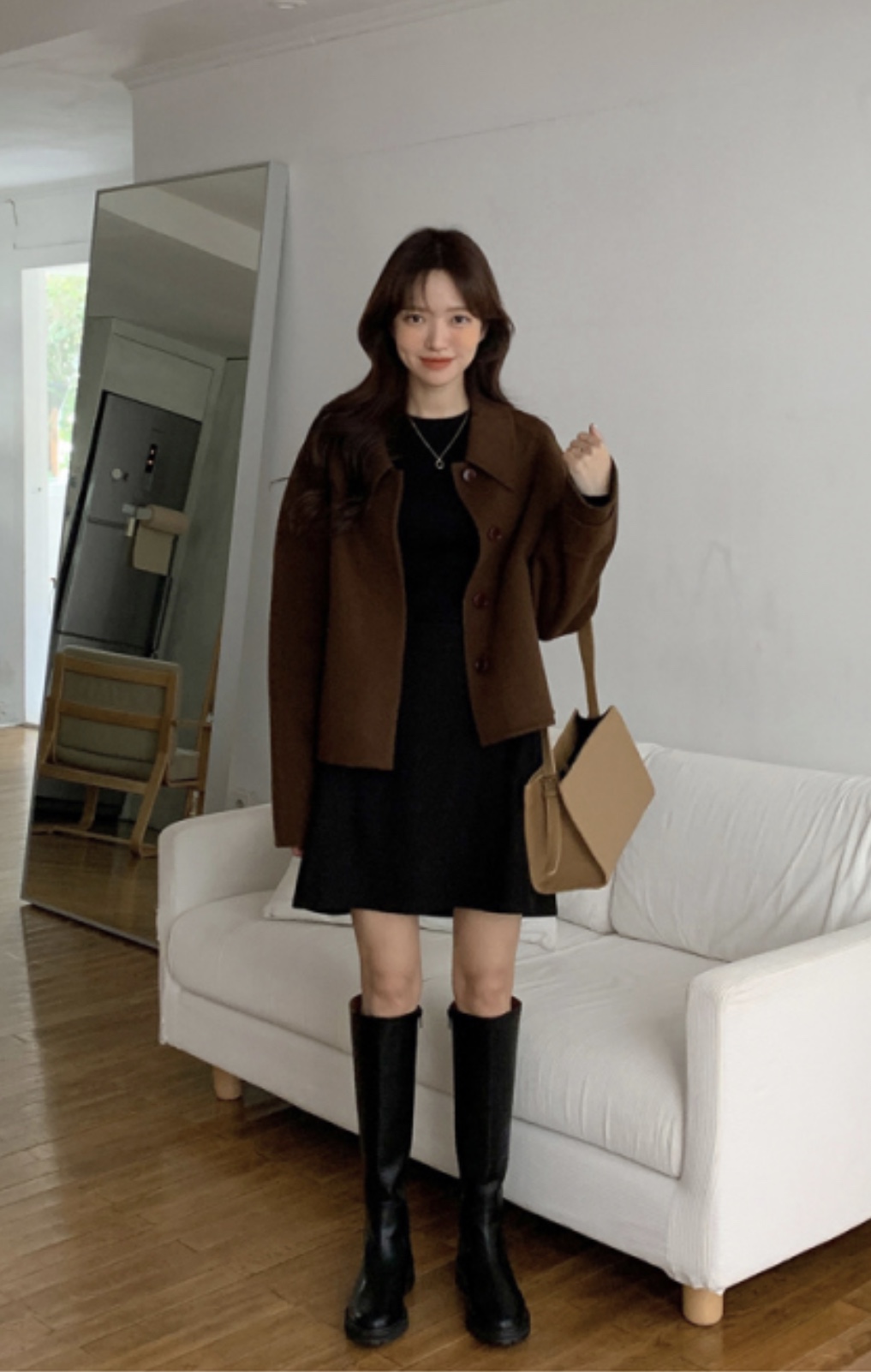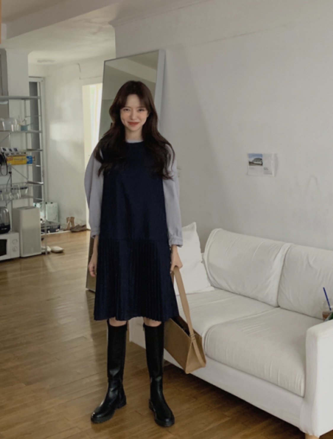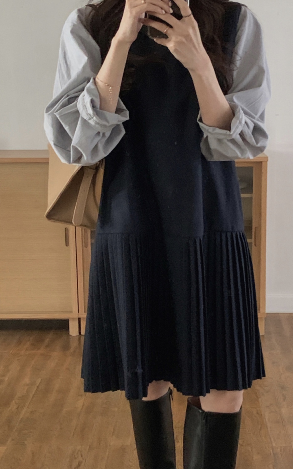 단색으로 깔끔하면서도 밋밋하지 않게 플리츠 디테일이 들어간 원피스는 격식 있는 자리에서 입기 좋은 아이템입니다. 그리고 원단을 긁어서 보풀 털처럼 만든 것으로 일반 기모보단 감촉이 부드럽고 보풀이 적은 소재입니다. 피치 소재 블라우스와 원피스랑 매치하니 따뜻해 보이고 정말 예쁘죠! 겨울 코트 안에 입기 좋습니다. 달트에서 코디 모으다가 이 부츠에 반하게 됐어요. 그래서 구매했습니다ㅎㅎ 오면 후기 남길게요