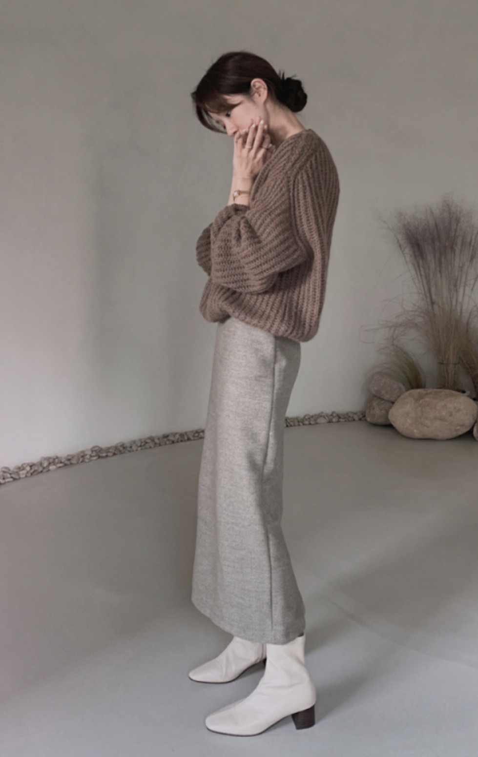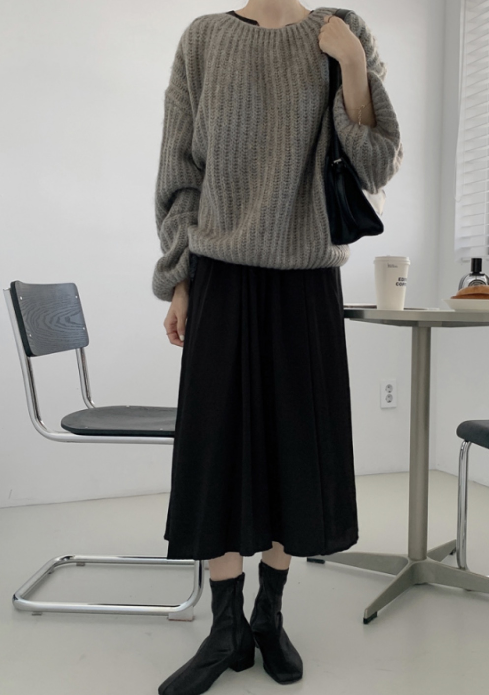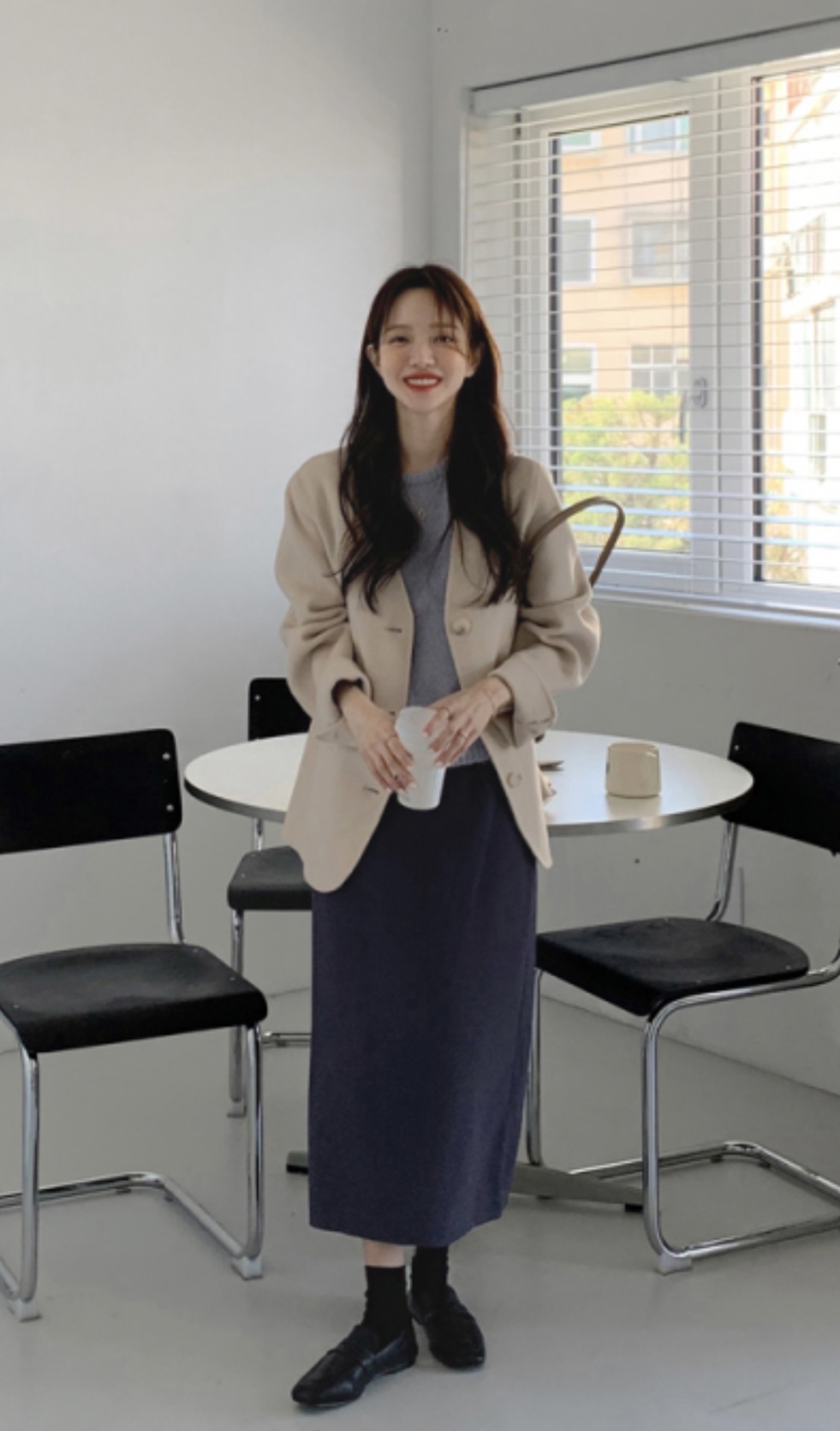 그리고 원피스와 같이 입는 니트의 소재 또한 너무 두툼하지 않고 밑단이 살짝 좁아져 원피스가 퍼지는 것을 잡아주는 실루엣의 니트가 좋습니다. 가디건 같은 경우도 짜임이 촘촘하고 평평한 소재를 선택해주세요!