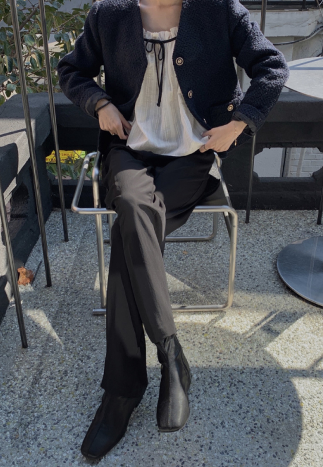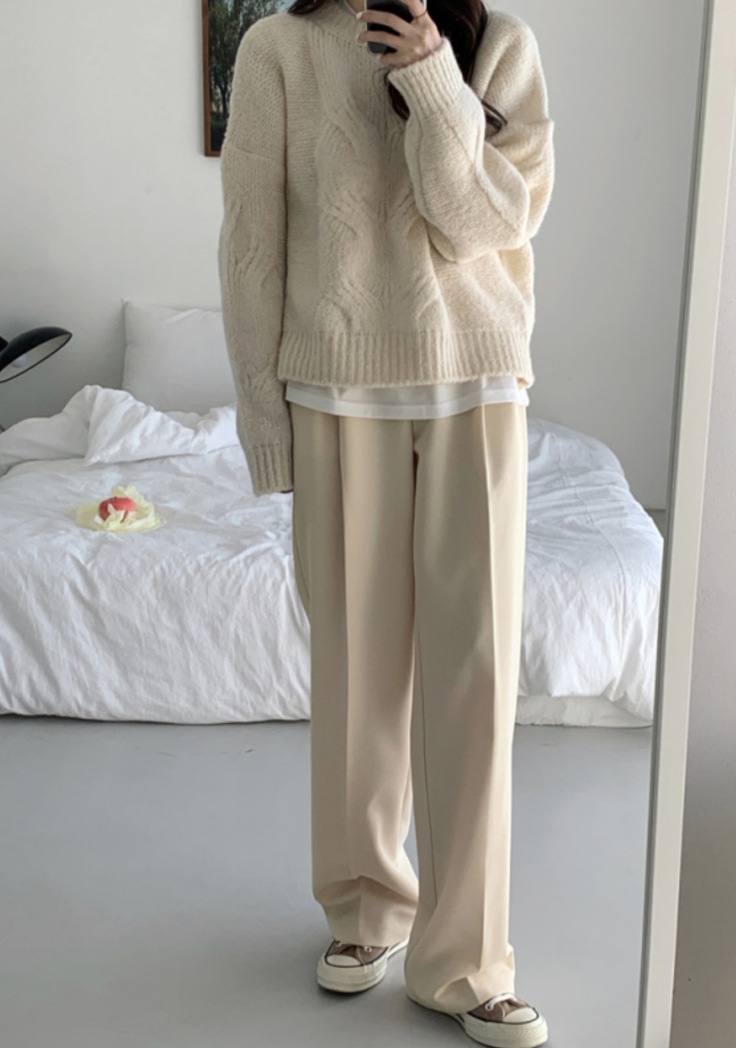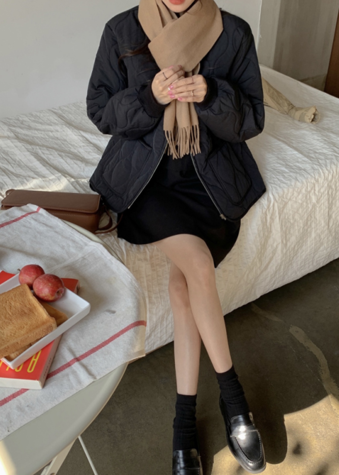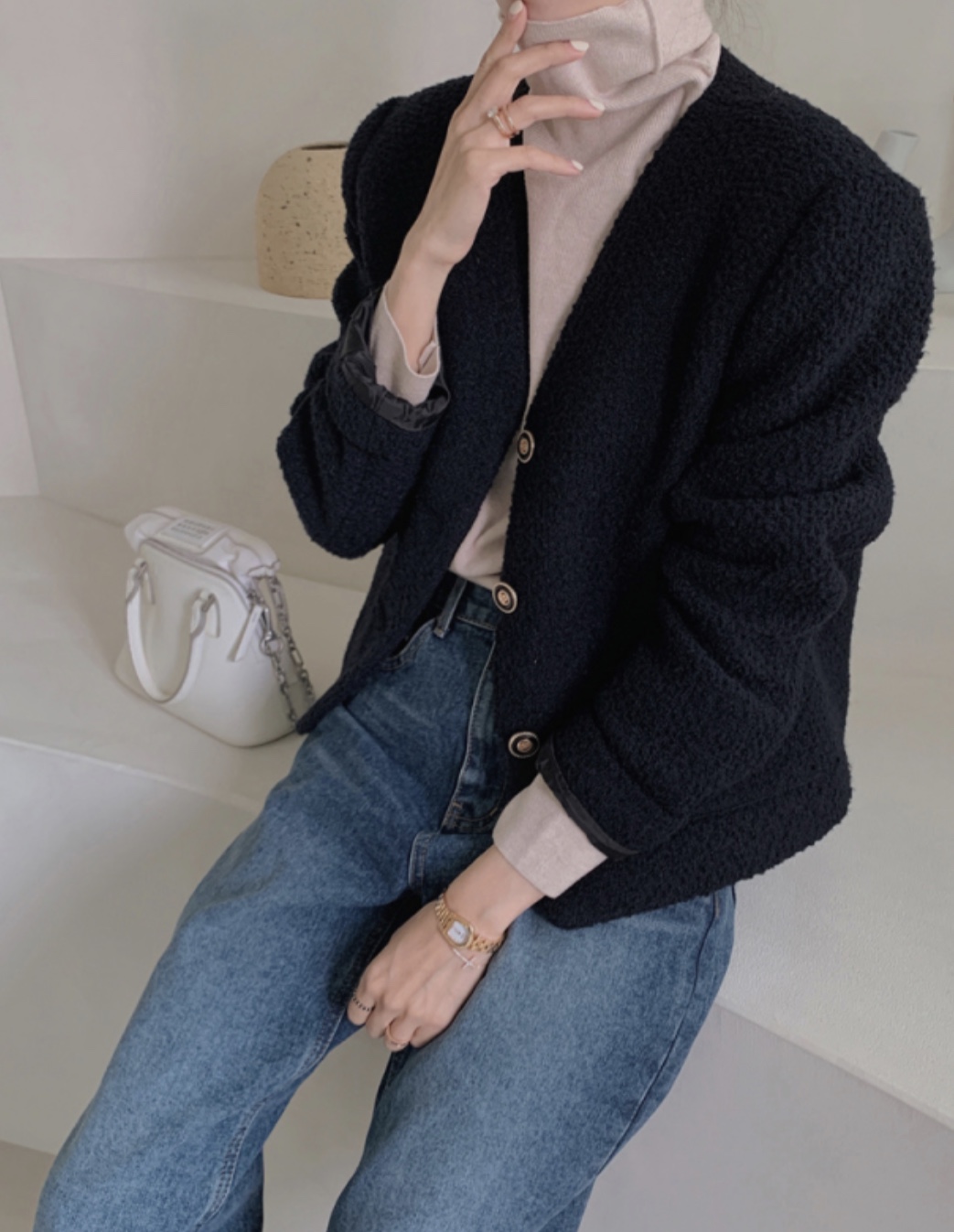 그리고 원피스와 같이 입는 니트의 소재 또한 너무 두툼하지 않고 밑단이 살짝 좁아져 원피스가 퍼지는 것을 잡아주는 실루엣의 니트가 좋습니다. 가디건 같은 경우도 짜임이 촘촘하고 평평한 소재를 선택해주세요!