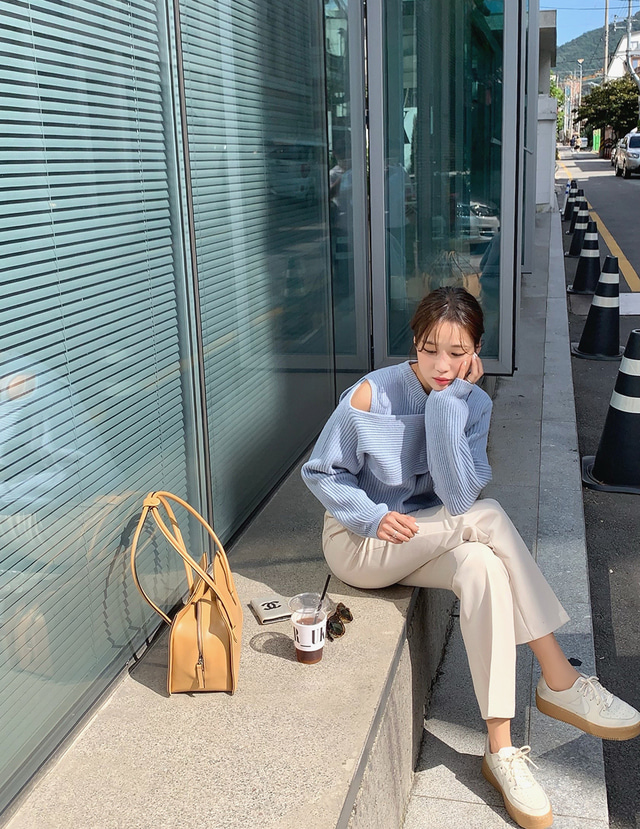하늘색 숄더트임니트가 눈에 확 들어왔습니다.